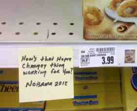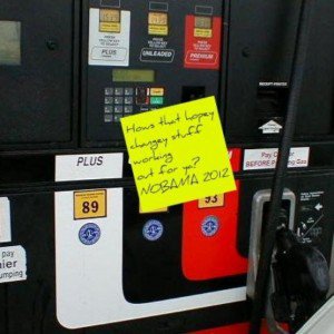 Purchase a pad of large sticky notes. Write on each one, “How’s that Hope & Change working out for you?” Every time you stop to fill your vehicle with gas, place your sticky note somewhere on the pump before you drive away. DO NOT be destructive in ANY way! Place your sticky note somewhere, so as not to impede the next customer’s abil…ity to read the pump’s digital readout.