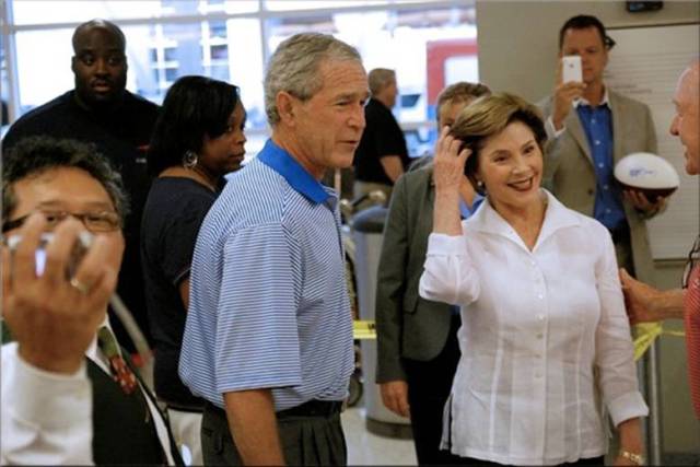 There’s a group of ladies in the Dallas area who make and stuff neck pillows for soldiers coming through Dallas Fort Worth airport. They go to the airport and meet the incoming planes every week and greet the soldiers coming back for a few weeks R&R, give them a pillow, tell them they pray for them, and thank them for their service. The lady who took the pictures said everyone was so surprised to see George and Laura Bush recently just standing quietly in the waiting area with others who come to meet the troop planes. She said it was amazing to watch the faces of the soldiers light up in recognition when they spotted them and that many came over to speak and shake hands.