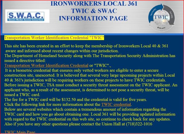 …information posted on a union website for ironworkers spelling out details on the Department of Homeland Security’s TWIC and SWAC programs.