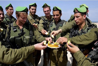 | Israeli servicemen on duty during the High Holyday season enjoy a platter of apples dipped in honey, a traditional symbol of the Jewish people’s constant hopes for a better, sweeter, more peaceful year. [Source] |