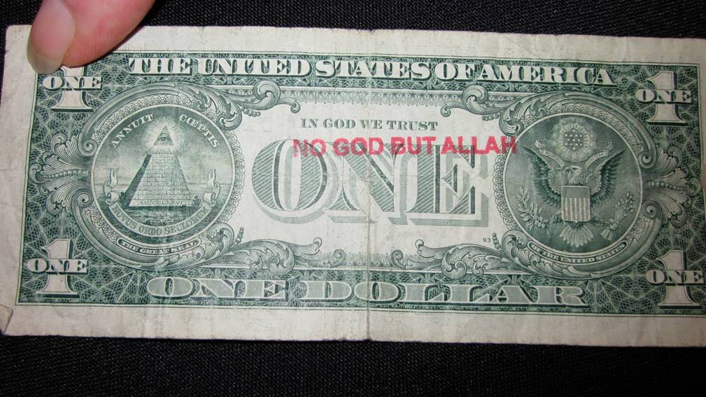 Underneath the words “In God We Trust” someone had stamped the dollar bill in red ink—NO GOD BUT ALLAH.