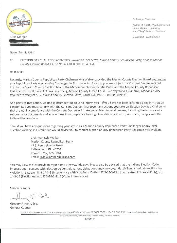 The Democrat Party has sent letters threatening every GOP Precinct Committeeman and Election Judge that if they do their jobs and question ANY votes for cause that they might be prosecuted and would be sued by the Democrat Party. Further they try to intimidate them that they have released all their personal information, names, addresses, etc, so that any interested person can find them.