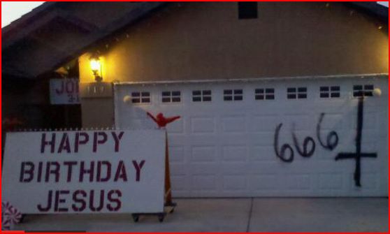 “It’s a ‘Happy Birthday, Jesus’ sign, and John 3:16 above the door frame,” Cannon described. Both are homemade and light up. They are near the graffiti.