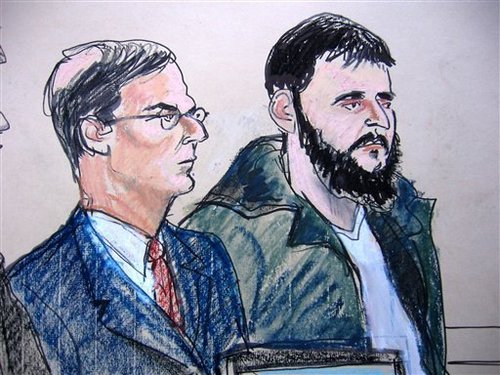 In this Jan. 9, 2010, courtroom sketch, defense attorney Robert Gottlieb, left, is seated next to his client, defendant Adis Madunjanin, at the federal courthouse in New York City.