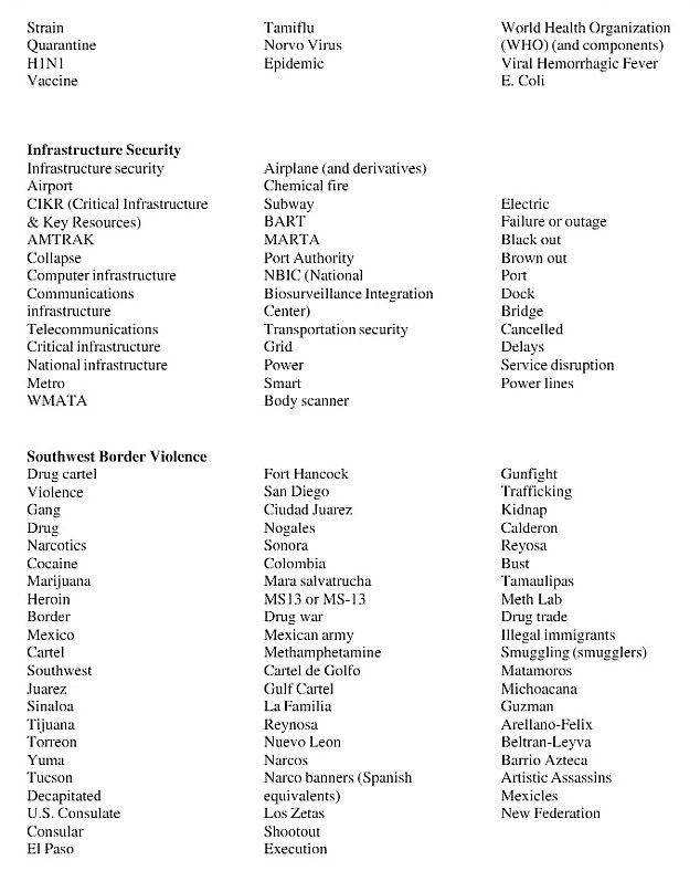 Read more: http://www.dailymail.co.uk/news/article-2150281/REVEALED-Hundreds-words-avoid-using-online-dont-want-government-spying-you.html#ixzz1wBQFsRnp