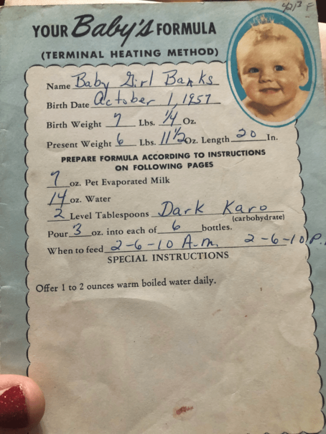 Photo Of Baby Formula Recipe From 1957. (Evaporated Milk & Karo Only Recipe)