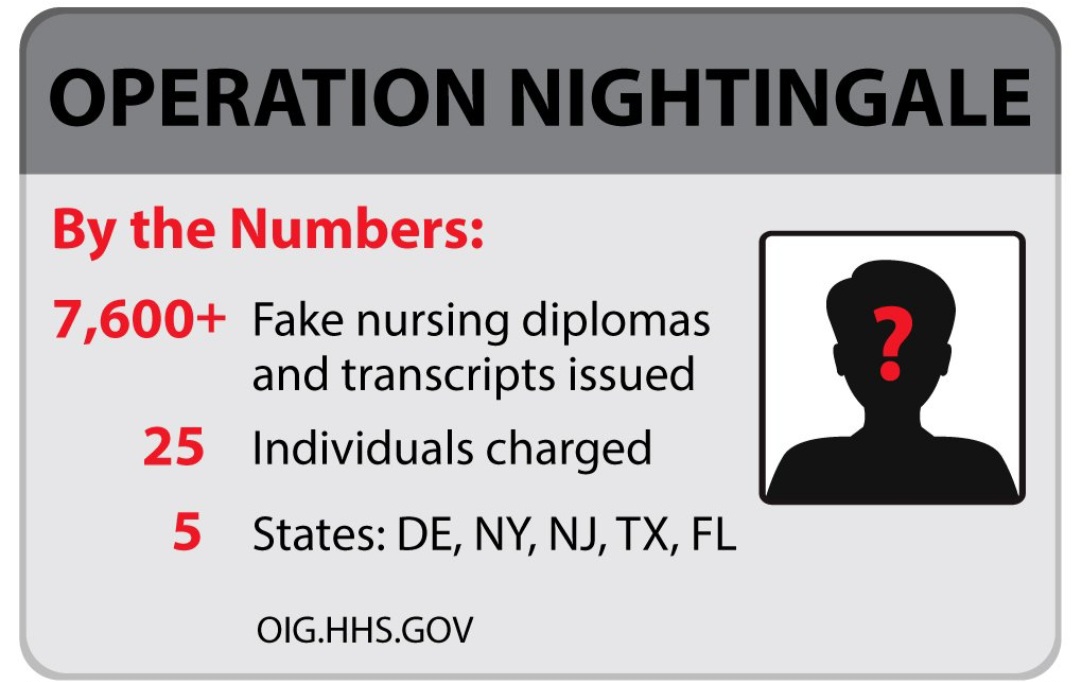 On January 25, 2023, the U.S. Department of Health and Human Services Office of Inspector General (HHS-OIG) and our law enforcement partners launched a multi-state coordinated law enforcement action to apprehend individuals engaged in a scheme to sell false and fraudulent nursing degree diplomas and transcripts. The enforcement action resulted in the execution of search warrants in Delaware, New York, New Jersey, Texas, and Florida, and 25 individuals being charged for their involvement in the fraud scheme.