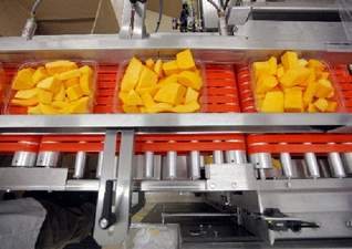 Cut-up butternut squash grown at Martin Farms passes by on the farm’s packaging line.