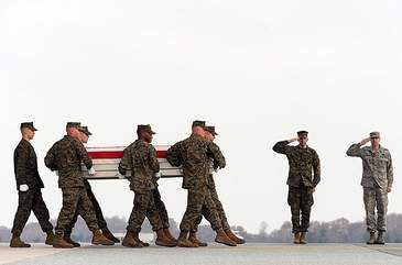A Marine carry team carries a transfer case containing the remains of Staff Sgt. Javier O. Ortiz-Rivera at Dover Air Force Base, Del.